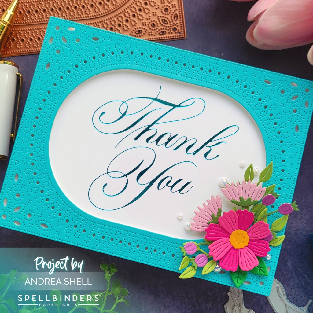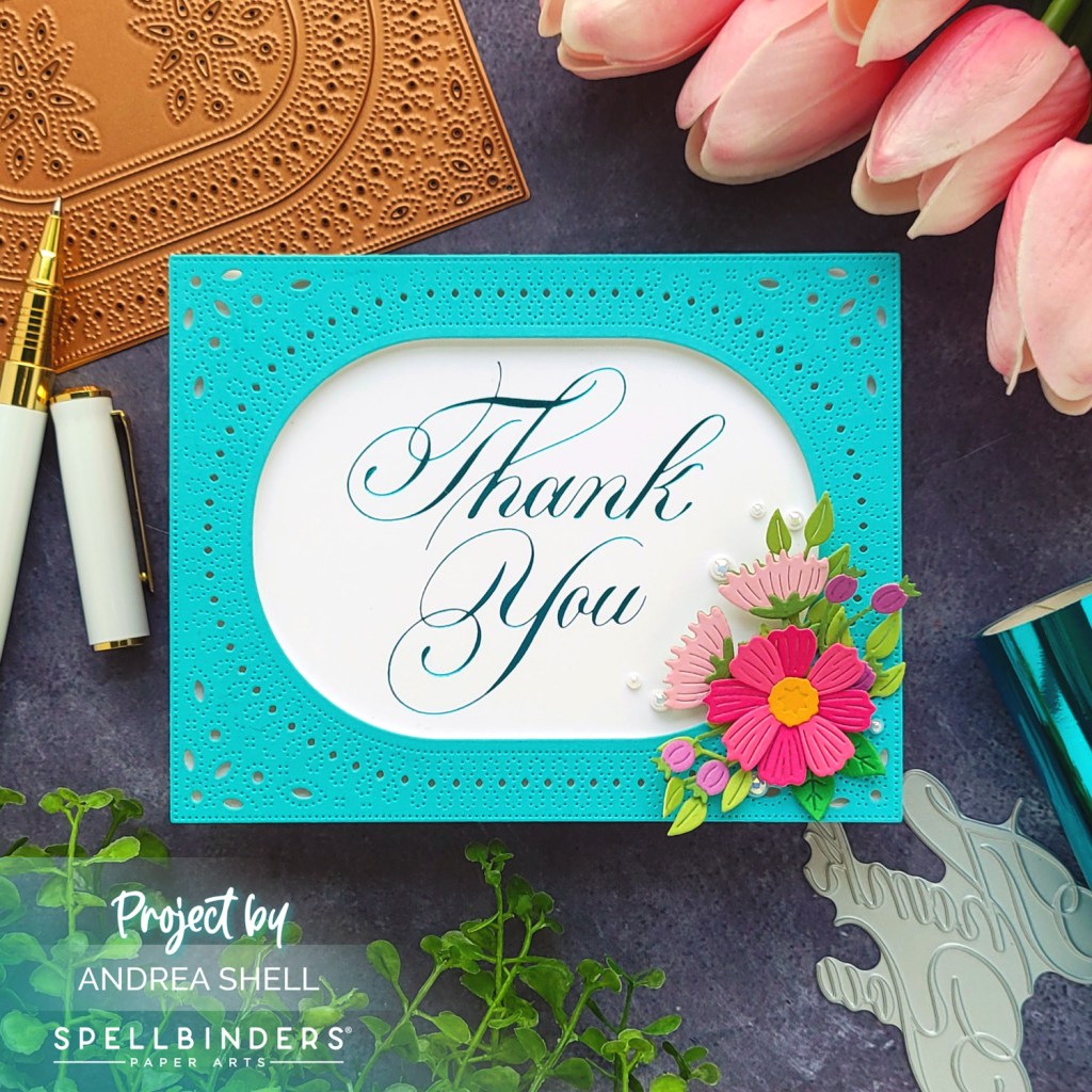 Hi there! Today I’m sharing an elegant, floral, thank-you card featuring products from Spellbinders.