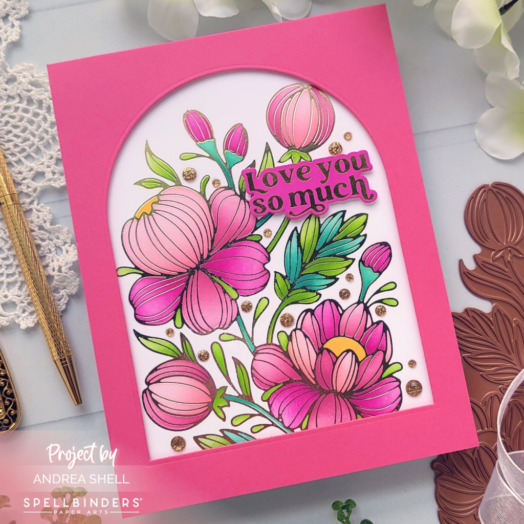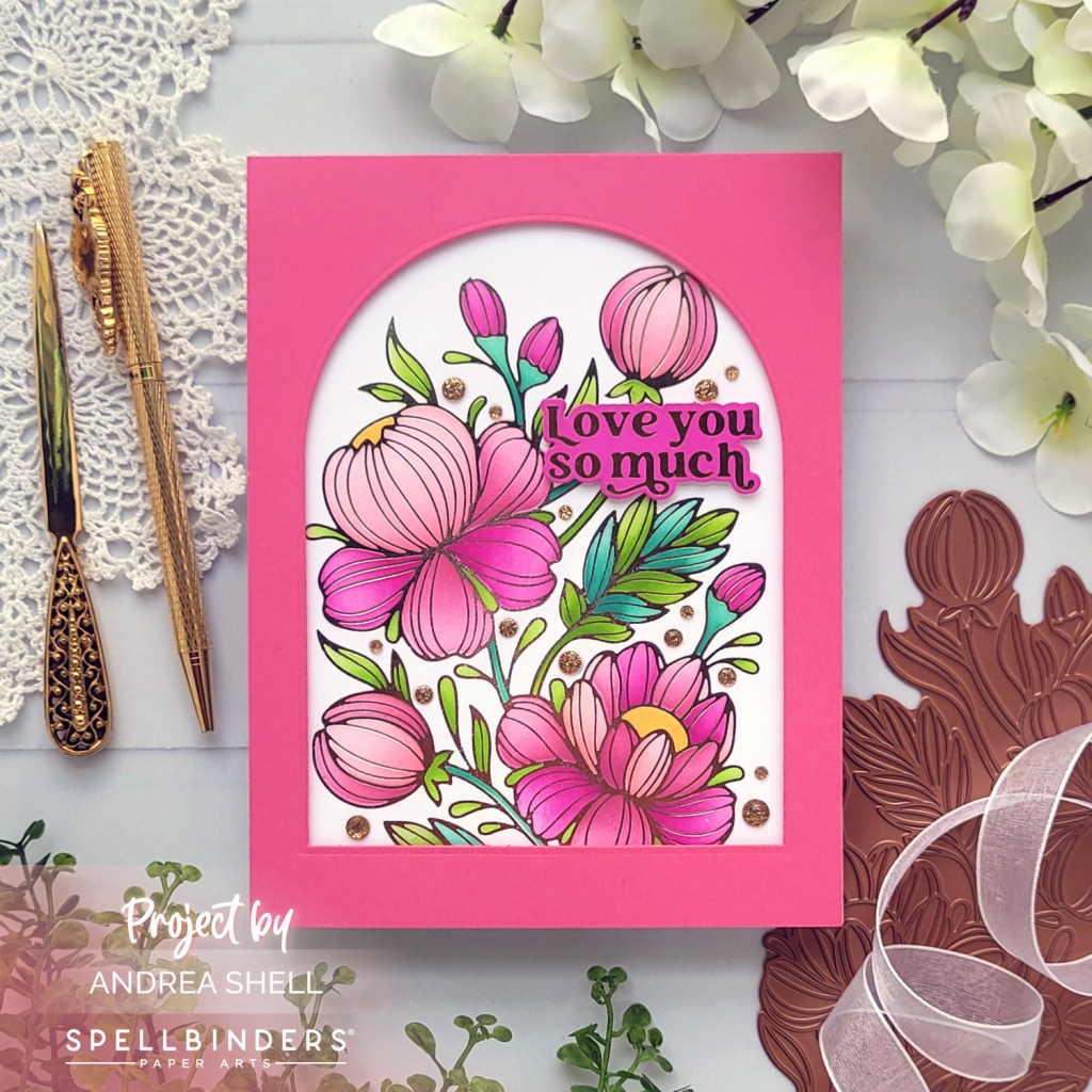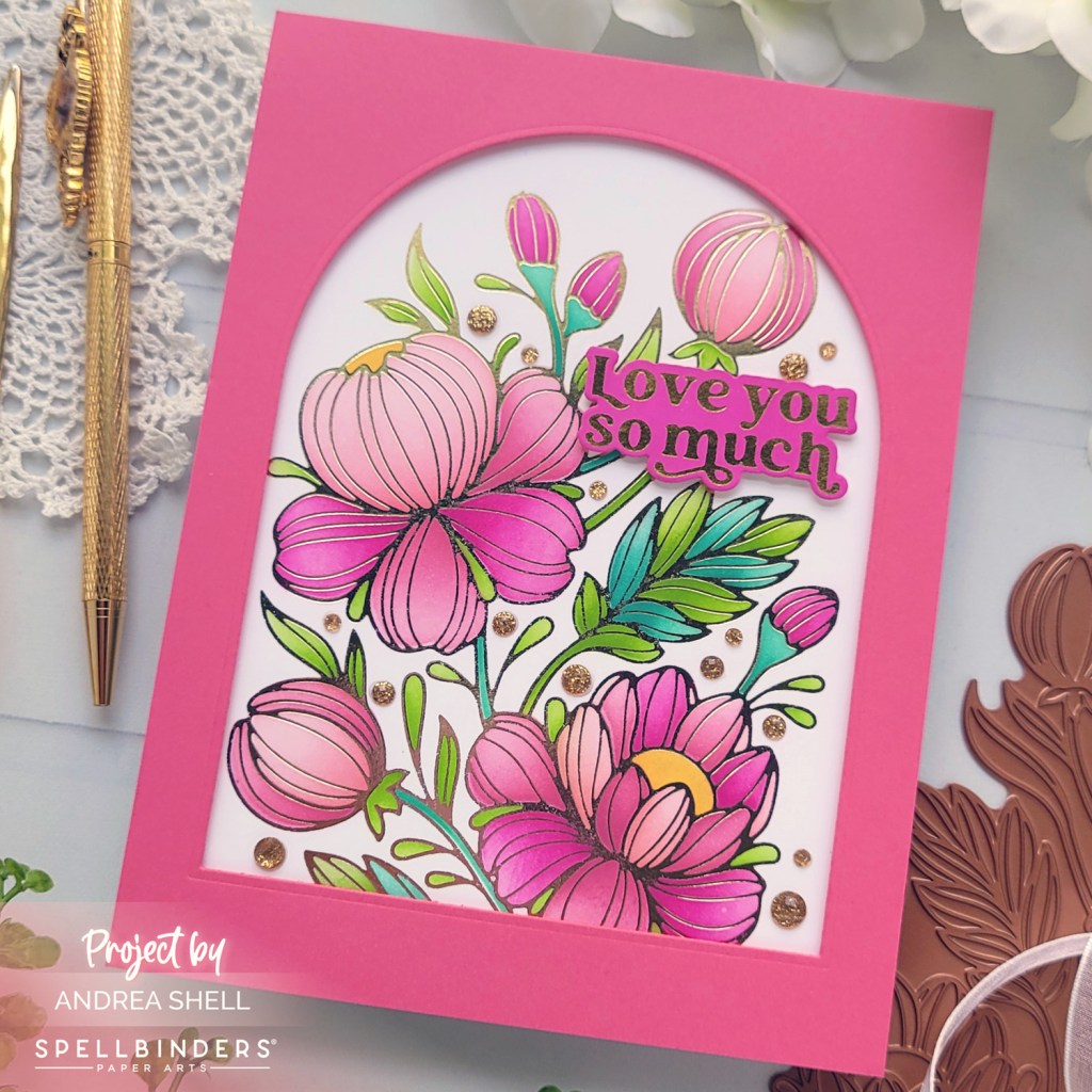 To create a frame for my image, I diecut pink cardstock with Spellbinders’ Essential Arches Dies (currently on sale!). I affixed the frame to my image with foam tape and adhered the piece to a white 5″x7″ card.