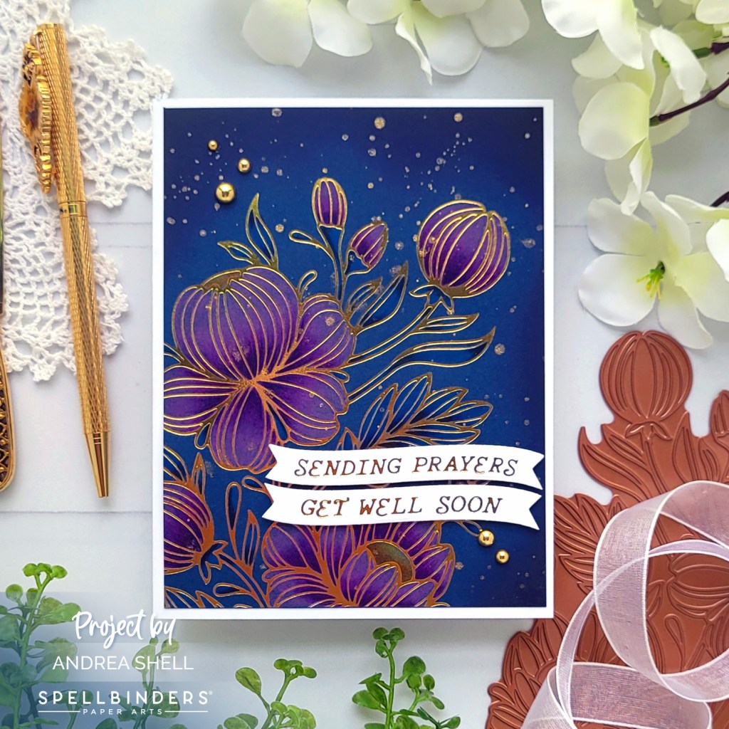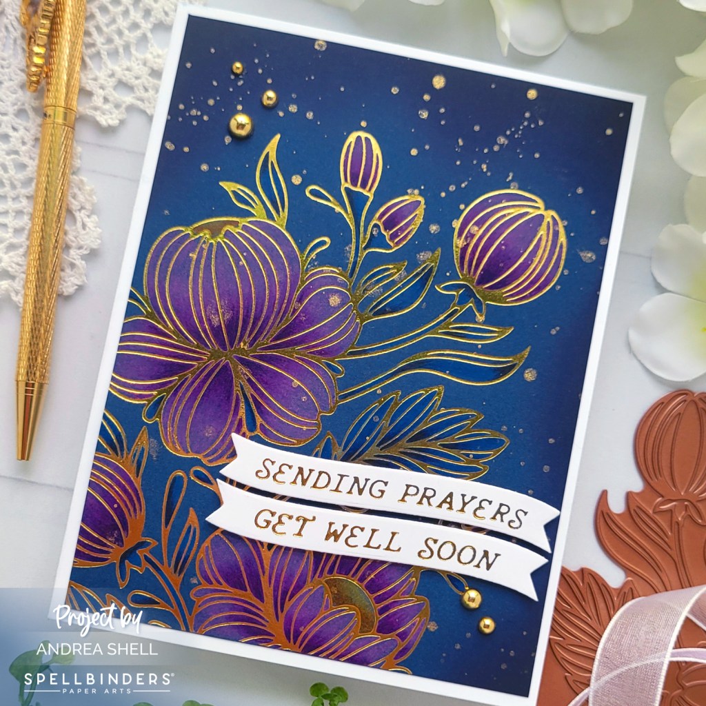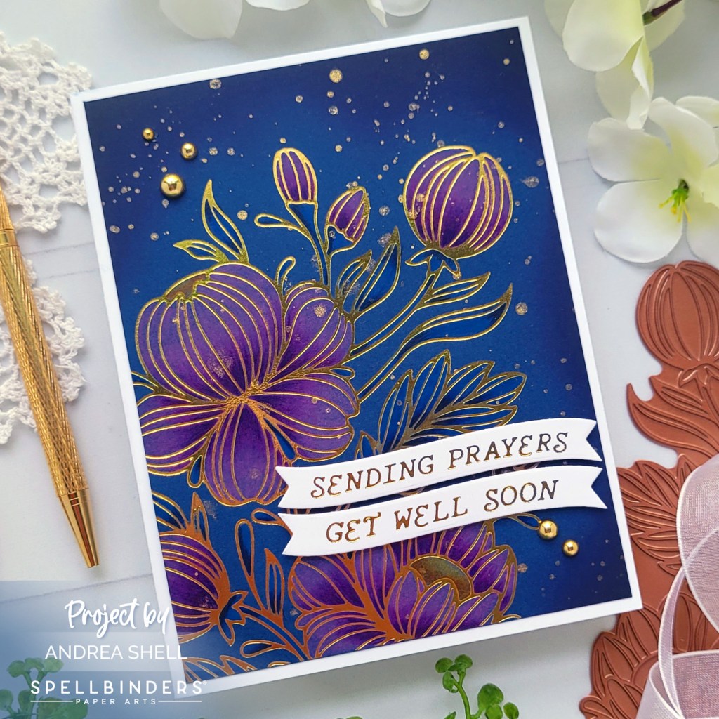 My second card uses the Glimmering Peonies Glimmer Plate without the stencil. I foiled the image with Goil Foil onto blue cardstock.