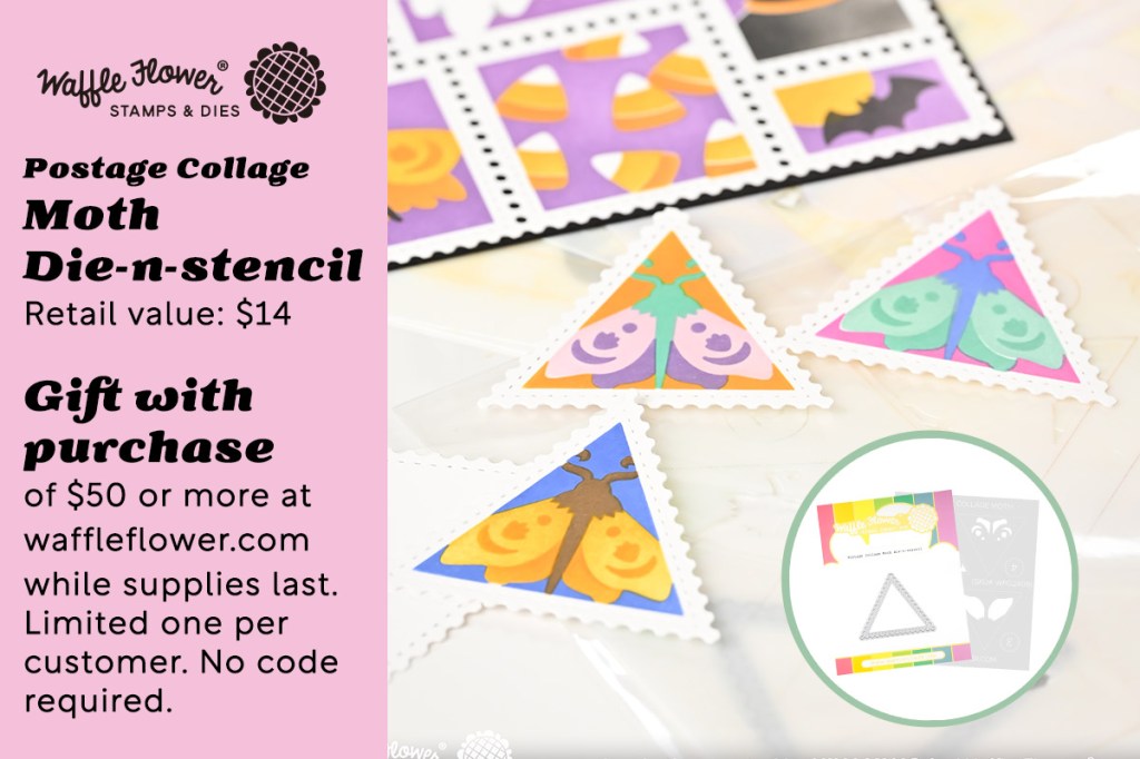 Thanks for stopping by! Don’t forget to check out the giveaway on my Instagram account for a chance to win a gift certificate to Waffle Flower! Also, the Postage Collage Moth Stencil-n-Die I used on a card one Wednesday is free with a $50 purchase, while supplies last.
