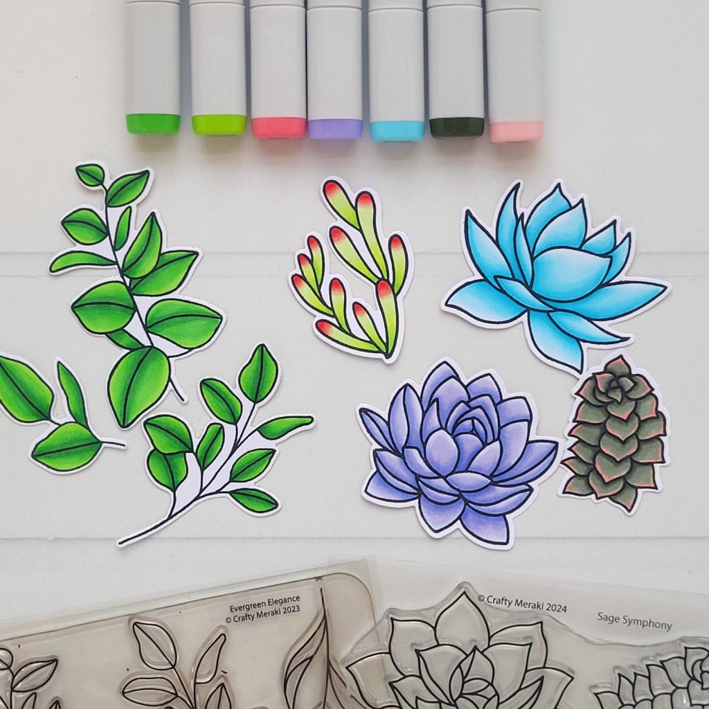 For this card I started by coloring some succulents and foliage from the Sage Symphony and Evergreen Elegance stamps. I colored all of the images with Copics and cut them out with the coordinating dies.