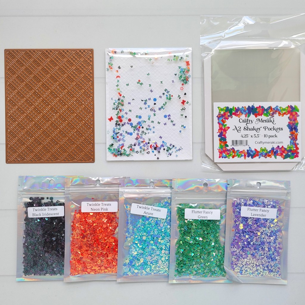 I used the Crafty Plaid Background A2 Die to emboss a panel of white cardstock. I trimmed the panel slightly to make it easier to fit into the A2 Shaker Pocket. After removing the protective film from the pocket, I placed the pocket facedown onto my desk and spinkled in the following sequin mixes: Twinkle Treats Azure, Twinkle Treats Black Iridescent, Twinkle Treats Neon Pink, Flutter Fancy Green, and Flutter Fancy Lavender. I laid my embossed panel on top of the sequins, removed the release paper from the pocket’s tabs, and secured the tabs to my panel.